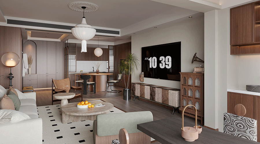 餐廳空間中,在原本層高較矮以及中間有梁的條件下,我們?cè)谠O(shè)計(jì)思路上運(yùn)用了強(qiáng)化梁位的設(shè)計(jì)手法,構(gòu)建出更有縱橫交錯(cuò)的幾何形體,植入梁位的圓形磁吸燈造型,強(qiáng)化了空間的穿插性和餐桌位置的區(qū)域感。