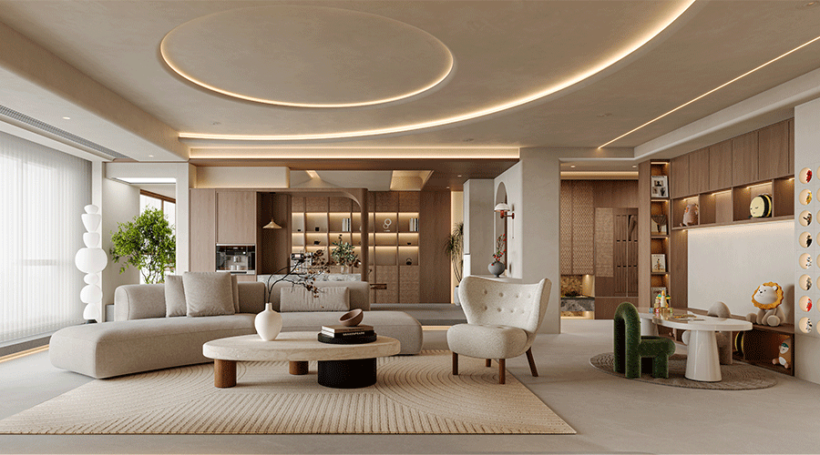在一樓室內(nèi)設(shè)計(jì)中,客廳巧利用中空空間的高度,打造出一個(gè)垂直感,在與二樓起居室形成聯(lián)動(dòng)關(guān)系,創(chuàng)造出可互動(dòng)空間。沙發(fā)區(qū)居中環(huán)繞擺放,這一布置可以大大增強(qiáng)違和感,還為孩子們創(chuàng)造了一個(gè)玩耍空間,增添了整體的趣味性。